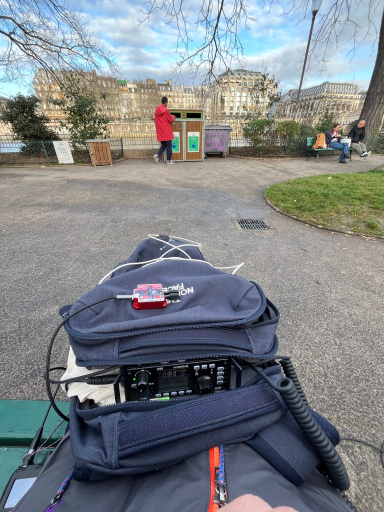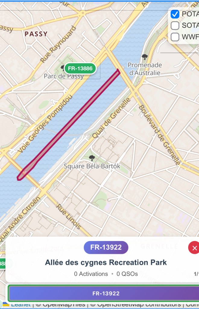 C’est en plein milieu de la Seine, sur l’île de l’Allée des Cygnes (POTA FR-13922) que j’ai réalisé cette dernière activation POTA pour 2025. Cette île située entre le pont de Bir-Hakeim et le pont de Grenelle est une ancienne installation portuaire qui est maintenant une très jolie promenade de 700m en plein milieu de la Seine.