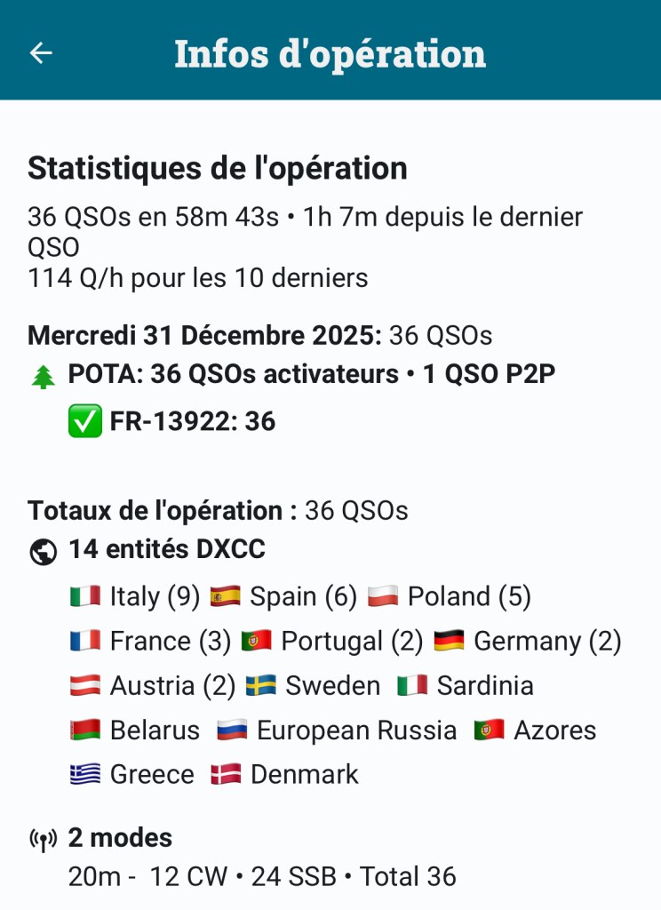 Je recommande l’endroit qui est superbe. C’était sûrement une journée un peu spéciale pour cause de 31 décembre mais néanmoins, j’ai l’impression que pour la radio HF, c’est plutôt très favorable.