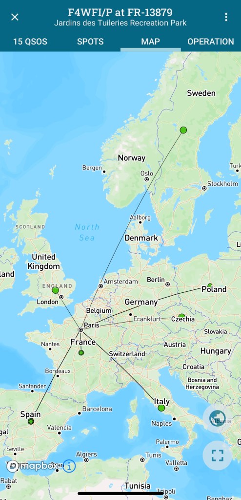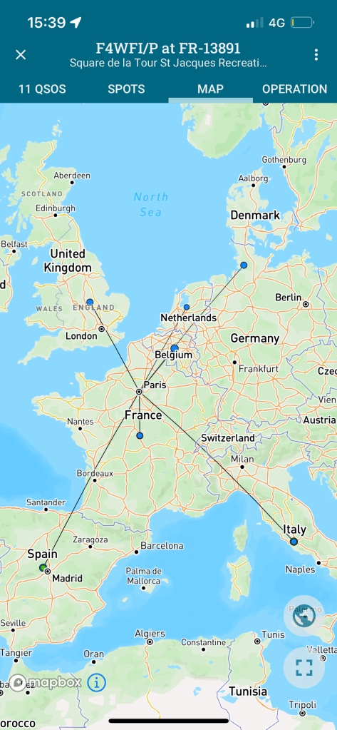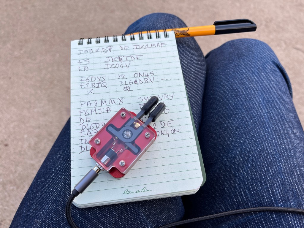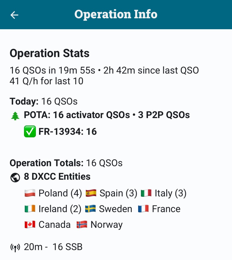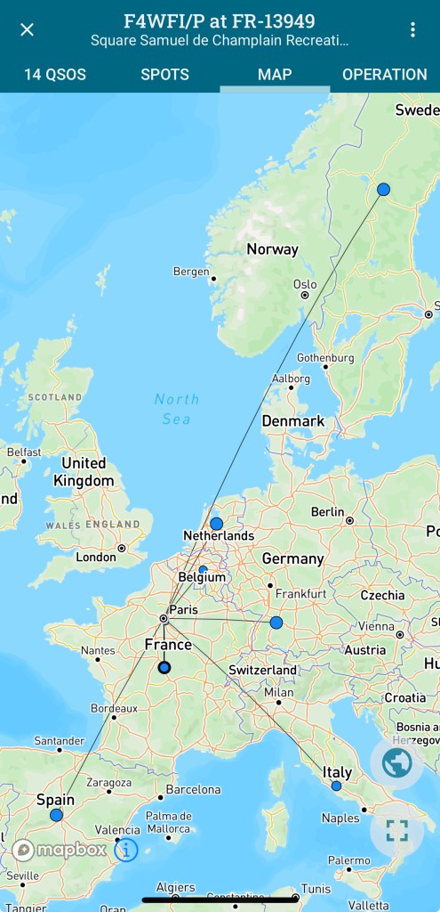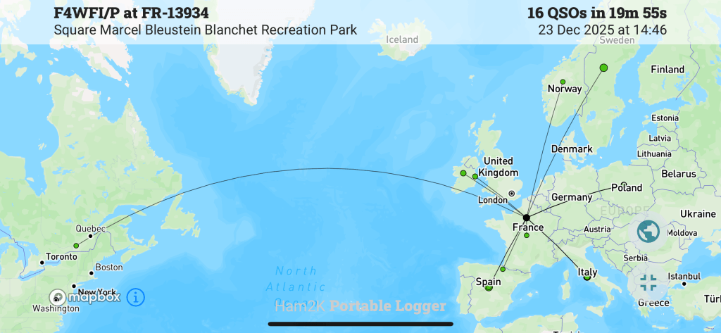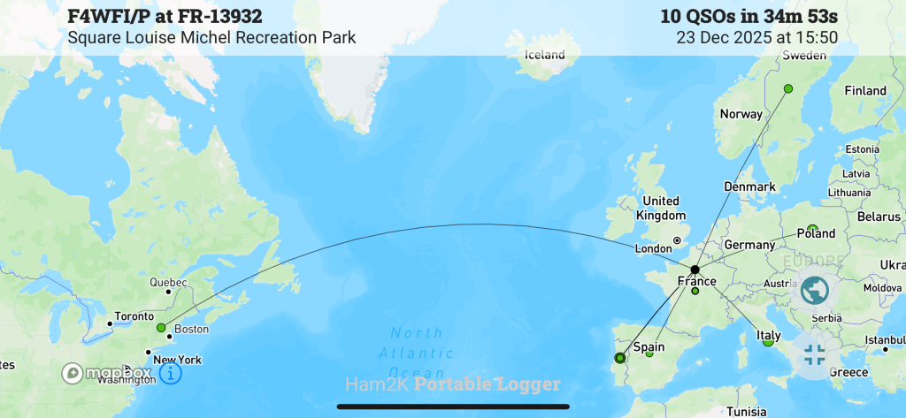 En montant la vidéo, j’ai réalisé que j’ai raté F4AGV (page QRZ) au tout début de l’activation. Son signal était un peu faible, genre 559 mais tout à fait audible. N’étant pas prêt, j’ai raté ces premiers envois et puis un OM surpuissant est arrivé ensuite avec le pile-up juste après. Désolé Chris, ce sera pour une prochaine fois.