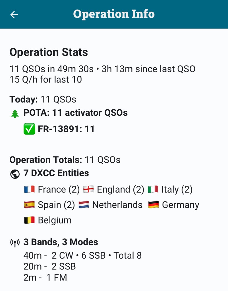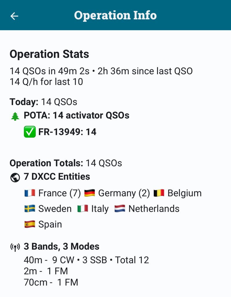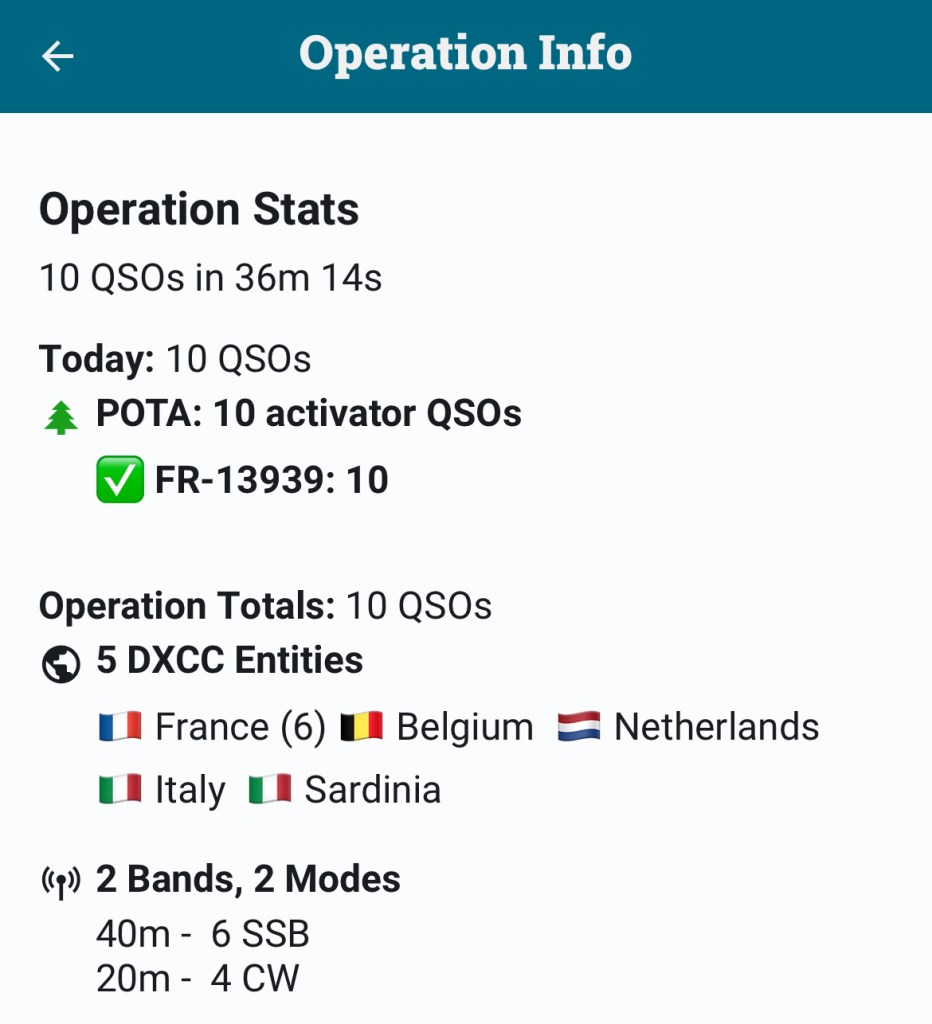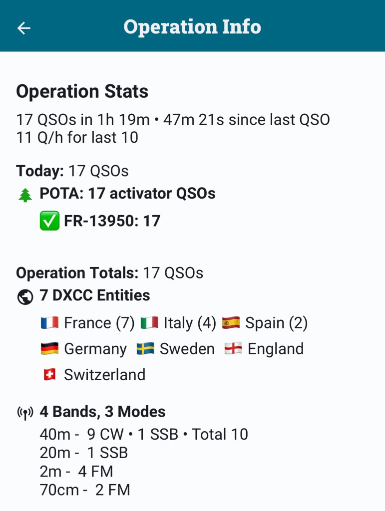 L’activation était validée avec les 10 QSO réglementaires en CW au bout d’un peu moins de 30min, ce qui est pas si mal pour mon niveau actuel de rapidité de décodage (après 6 mois de CW).
