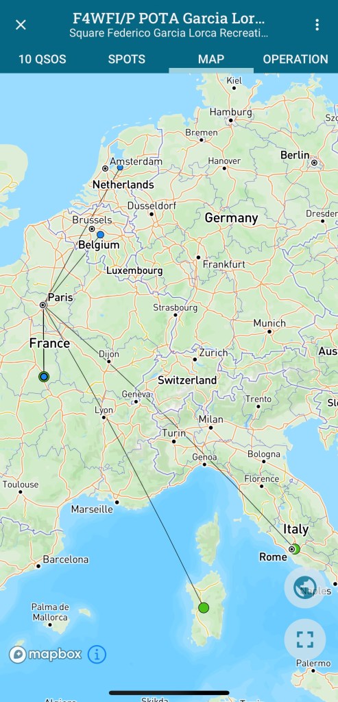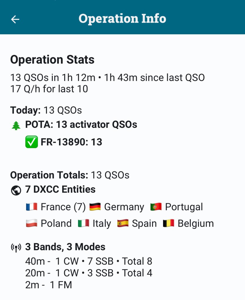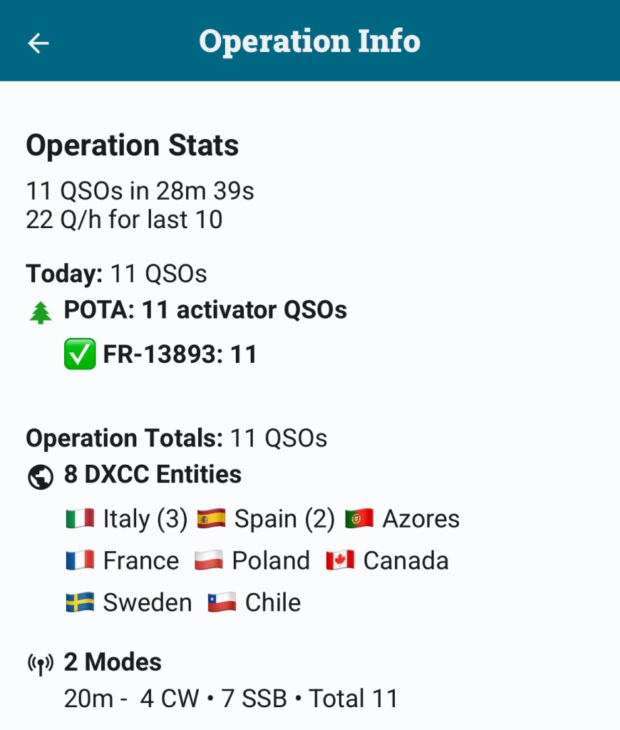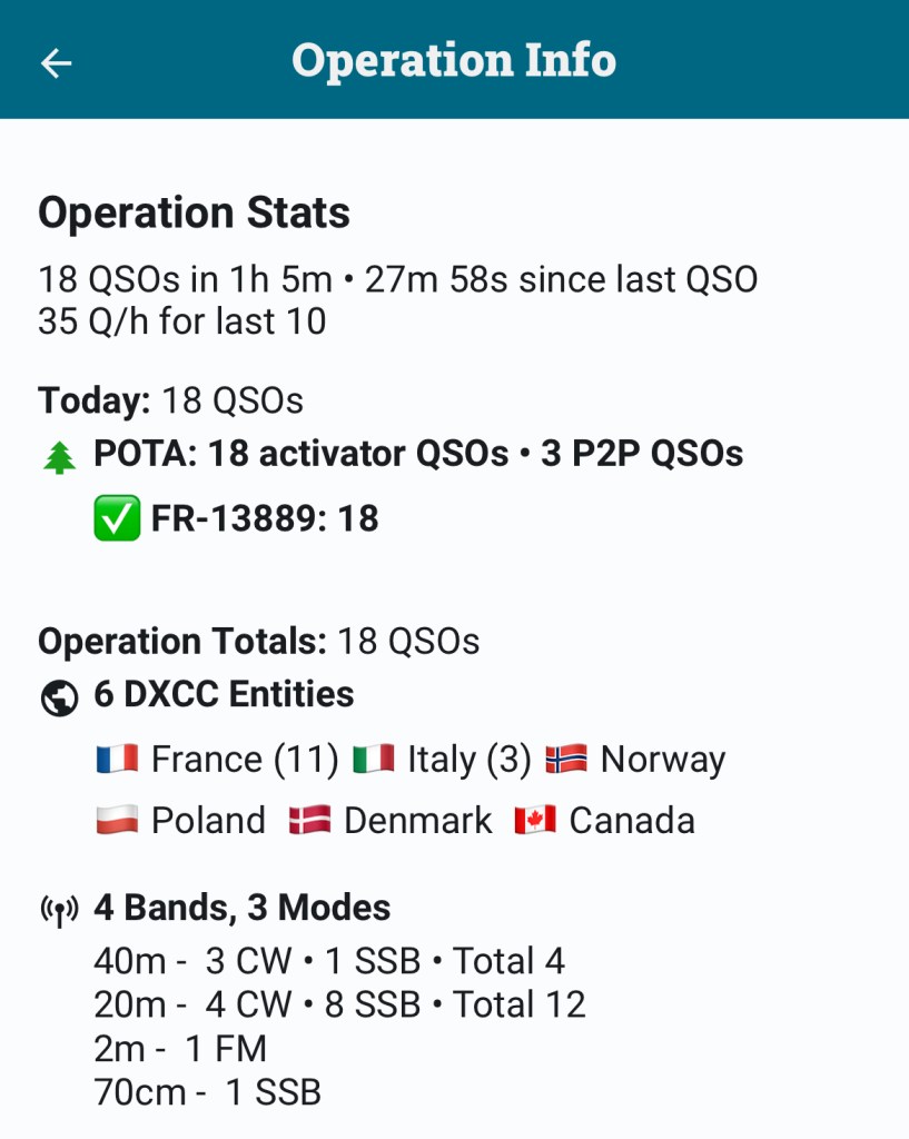 L’activation était validée avec les 10 QSO réglementaires en CW au bout d’un peu moins de 30min, ce qui est pas si mal pour mon niveau actuel de rapidité de décodage (après 6 mois de CW).