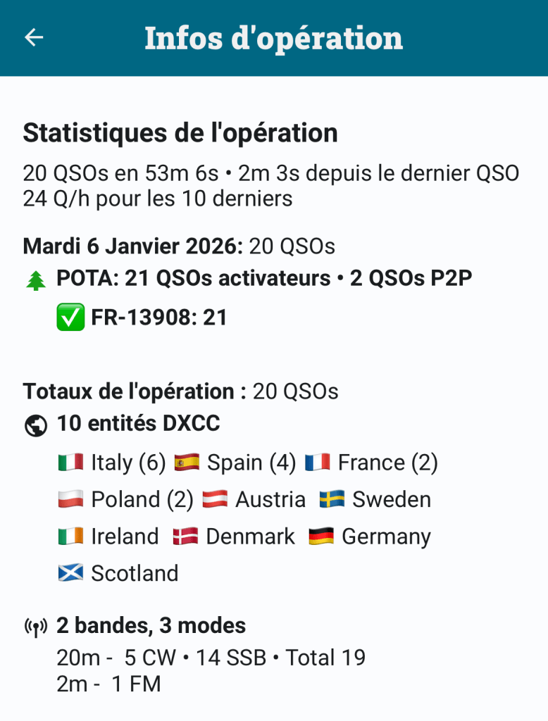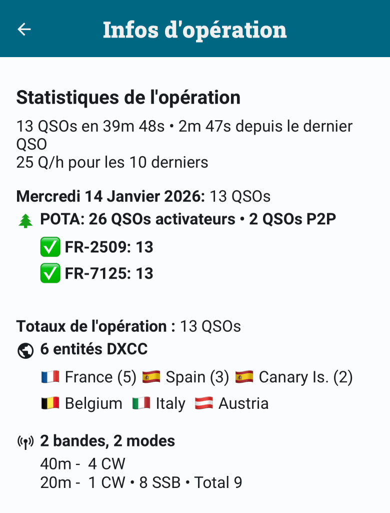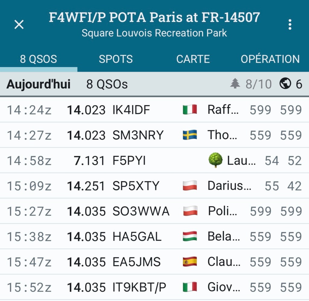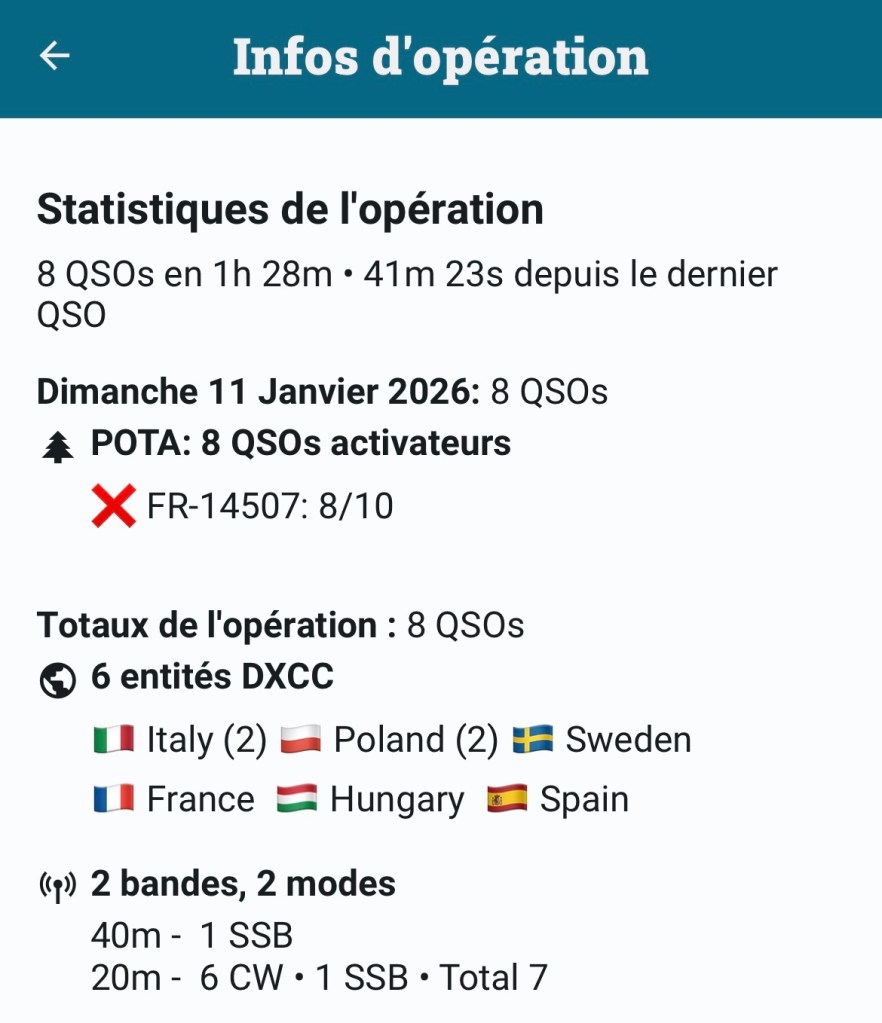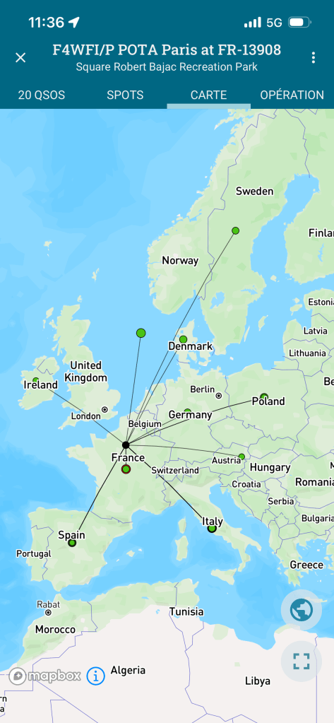 5 QSO seulement en CW, sans doute à cause du WWA (hamaward.cloud/wwa) qui mobilise beaucoup les télégraphistes donc ça fait moins de chasseurs sur les ondes. J’ai terminé en phonie, ce qui est bien sympa aussi.