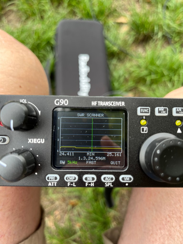 Le TOS est excellent sur 24 MHz (12m) avec le segment télescopique entièrement déployé. Si on rentre un segment, on monte à 28 MHz (10m). Je n’ai pas pu faire de test plus haut en fréquence car le G90 ne monte qu’à 30 MHz.