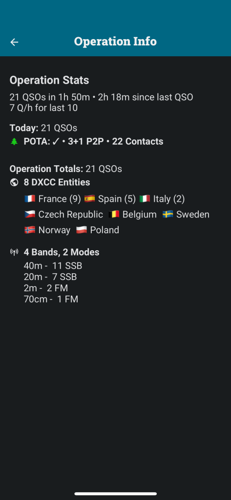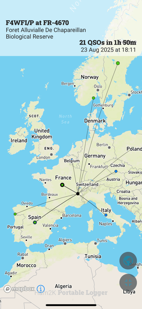 21 QSO un peu partout en Europe et aussi deux QSO plus locaux sur 2m et 70cm. Eh oui ! Il ne faut pas négliger les ondes très courtes lors d’une activation POTA. Ce fut ainsi l’occasion de faire un long QSO passionnant avec Xavier F1PBQ et Jean-Marie F1PGQ (page QRZ) qui s’occupe des relais de Saint-Maximin F1ZXZ sur le réseau ARA (ara-r.fr) et F1ZWY.