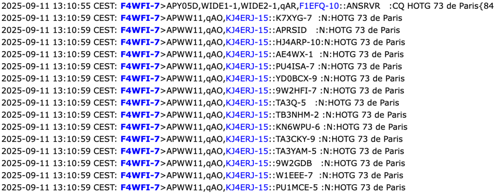 Pour faire simple, c’est un réseau sur lequel on fait un check-in avec un message particulier en utilisant ce format « CQ [space] HOTG [space] Your message » et en l’adressant à cette adresse ANSRVR. Une fois le check-in fait on reçoit des messages d’autres stations auxquelles on peut alors répondre.