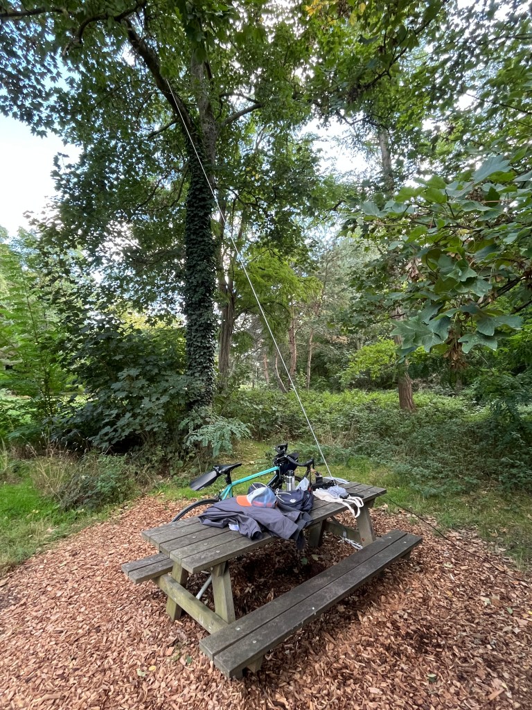 Bon, je me suis fais quand même la blague du mec qui accroche son antenne dans un arbre et qui réalise qui lui manque un adaptateur BNC/SO-239 !! Obligé de faire un aller/retour à la maison. Ca m’a fait faire un peu de vélo.