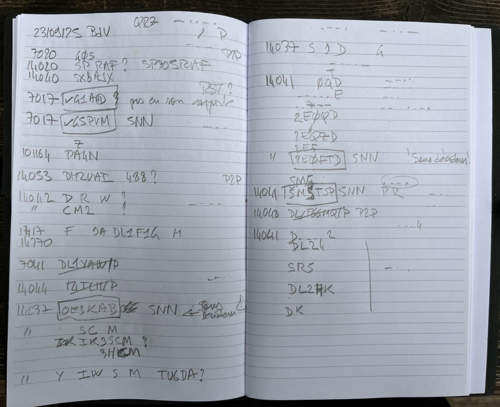 Une photo de la page de mon cahier prouve à quel point je galère encore sévèrement pour décoder les indicatifs à la volée :