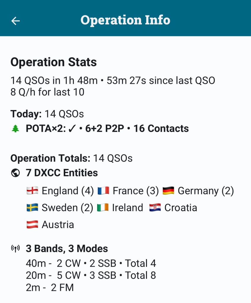 14 QSO dont la moitié en CW, c’est déjà un joli score pour un novice en la matière ! Je pensais pouvoir faire plus facilement des POTA-to-POTA (dit aussi Park-to-Park ou P2P en abrégé) en CW mais ce n’est pas si évident de faire le QSO, surtout qu’en général l’OM est un télégraphiste chevroné donc il faut lui faire répéter pas mal de fois.
