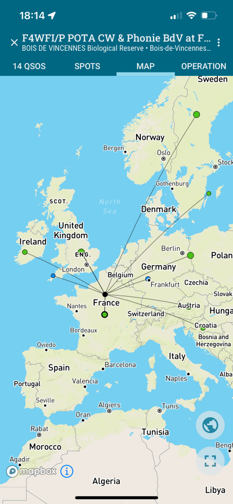 Mon intention initiale était de faire une activation POTA au Bois de Vincennes 100% CW mais finalement j’ai panaché aussi avec quelques QSO en phonie. En effet mon niveau à l’écoute en CW n’est pas encore assez bon pour pouvoir décoder les émissions sans problème, ça me demande encore beaucoup de CPU !