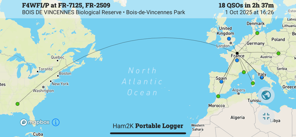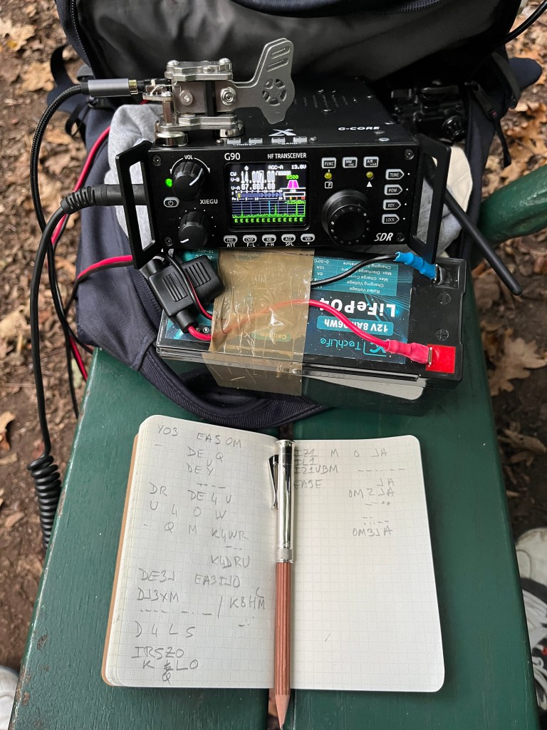Eh bien c’est chose faite aujourd’hui. Je suis tout content. Je ne dis pas que je n’ai pas galéré un peu beaucoup par moment, la photo de mon carnet en est la preuve, mais j’ai pu réaliser 18 QSO en un peu plus de 2 heures dans mon cher Bois de Vincennes..