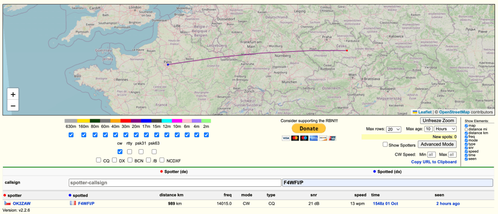Petite curiosité que je ne m’explique pas : durant les deux bonnes heures passées à manipuler, je n’ai eu qu’une seule trace sur le Reverse Beacon Network alors que j’ai fait des QSO un peu partout en Europe.