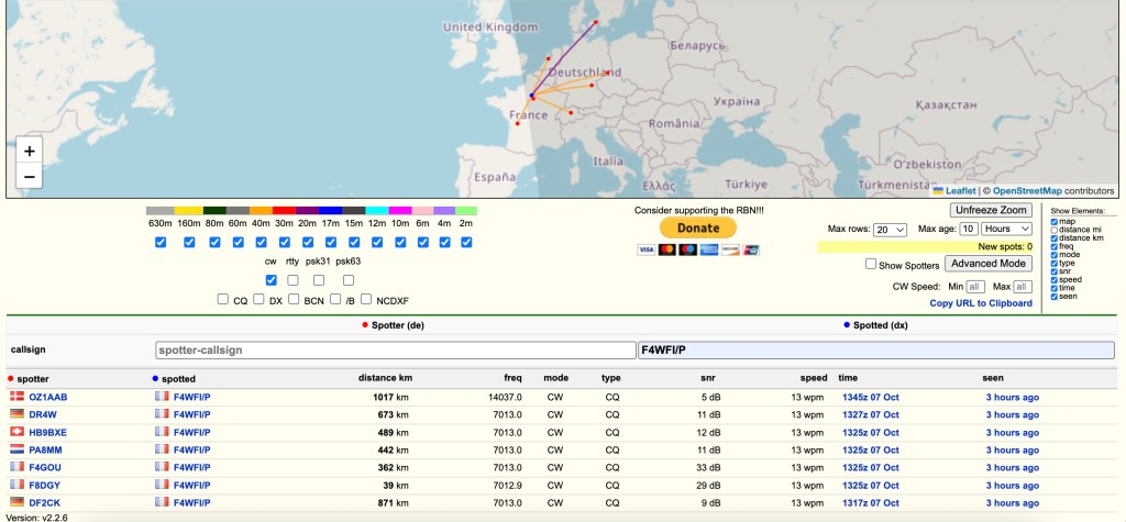 J’ai déjà parlé du Reverse Beacon Network (reversebeacon.net), c’est un outil hyper pratique pour avoir une estimation de la portée qu’on obtient en fonction des conditions du moment (radio, puissance, antenne, propogation, etc.).