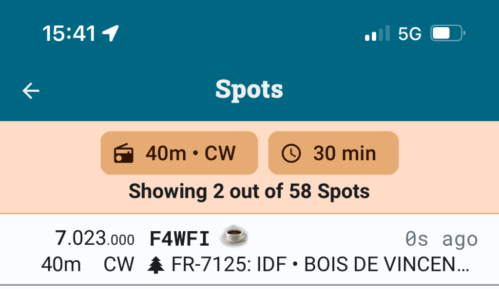 Quelques instants plus tard, je me voyais spotté dans l’application Ham2K Polo. Par contre l’indicatif n’est pas bon puisqu’il devrait être avec un /P mais je ne sais pas comment envoyer cette information.