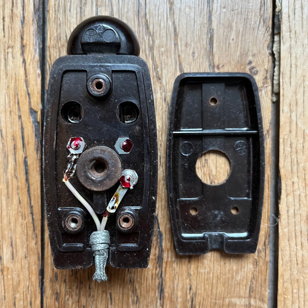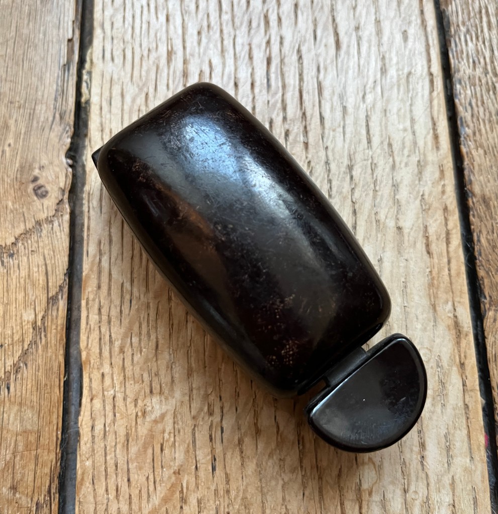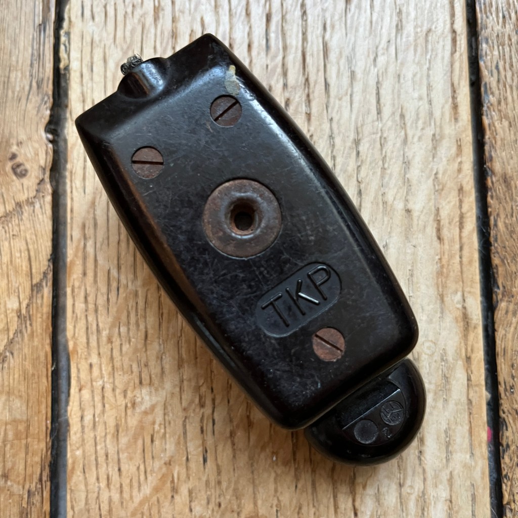 Cette clé est la célèbre clé « souris » de la Seconde Guerre mondiale, l’une des clés les plus utilisées par l’armée allemande. Cette clé particulière est dotée d’un demi-bouton et date de 1944. Comme la plupart des clés souris, elle est équipée d’un couvercle rabattable de type clapet. Il s’agit d’une petite clé, mesurant seulement 7,6 cm sur 3,8 cm. Le bouton est légèrement concave, ce qui est également typique des clés allemandes en général. Les parties en bakélite sont de couleur marbrée brune et constituent le type le plus courant de ces clés.