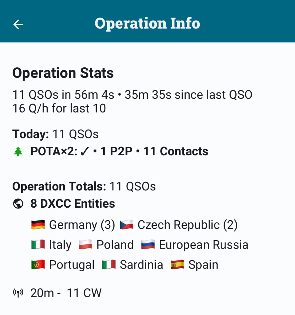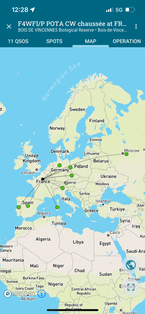 L’idée n’est pas de faire un concours de vitesse mais plutôt de mesurer les progrès faits depuis que je me suis mis à la CW. En fin de matinée je suis allé au bois de Vincennes en bas de la maison pour me faire une petite activation POTA.