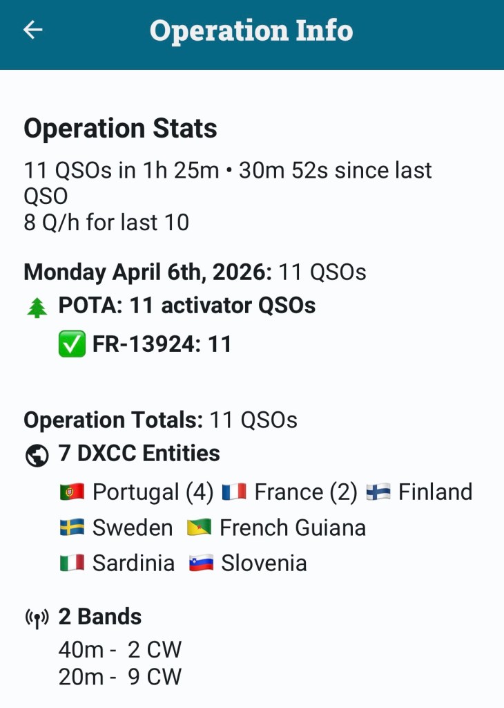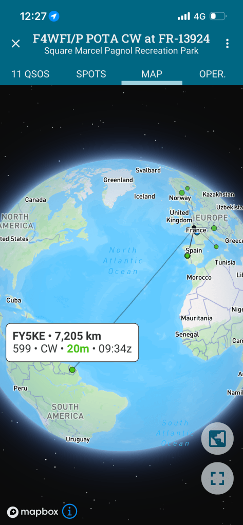 J’avais déjà fait la Guyanne en QSO en CW mais la fois précédente c’était avec le Xiegu G90 (avec 20W) et une antenne EFHW dans les arbres. Ainsi, arriver à refaire ce genre de QSO avec un matos ultra portable qui tient dans la poche, c’est classe.