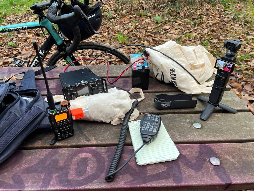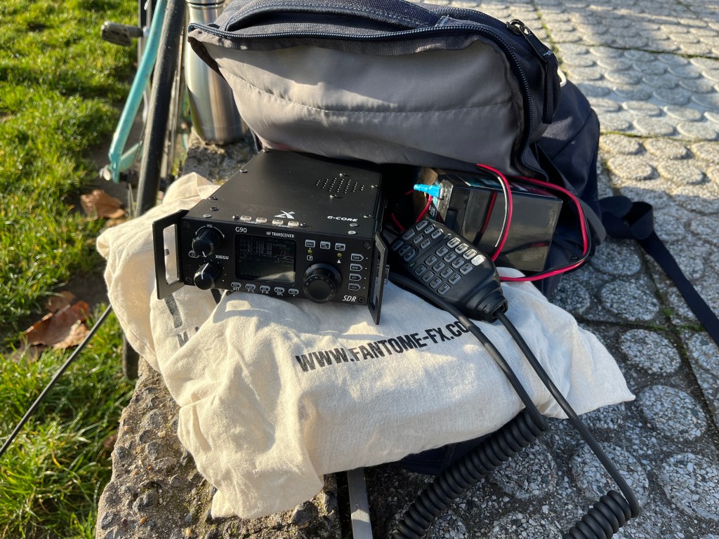 J’étais parti avec mon sac à dos avec tout mon matos HF (Xiegu G90 et antenne Radioddity HF-009) ainsi que deux pockets : mon fidèle Yaesu FT-5D et aussi mon Quansheng UV-K5 s’il me venait l’idée saugrenue de tenter des QSO en CW.