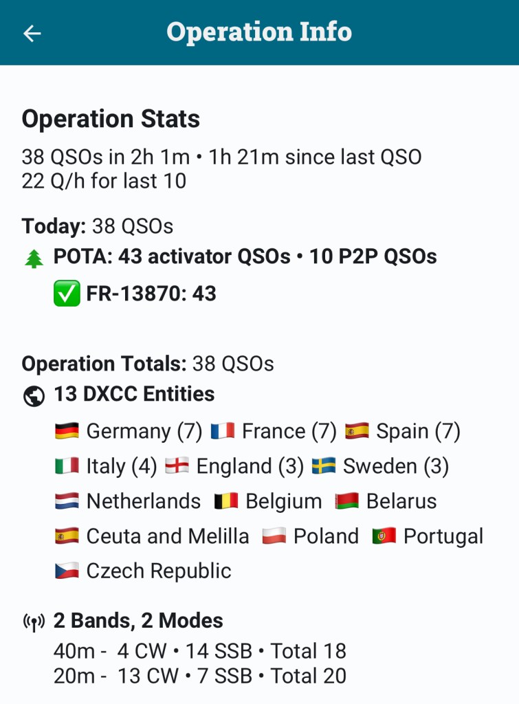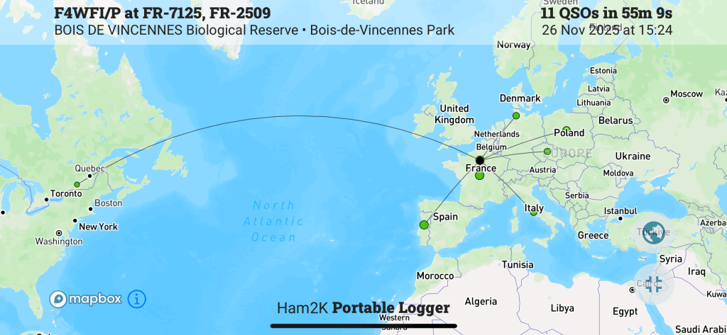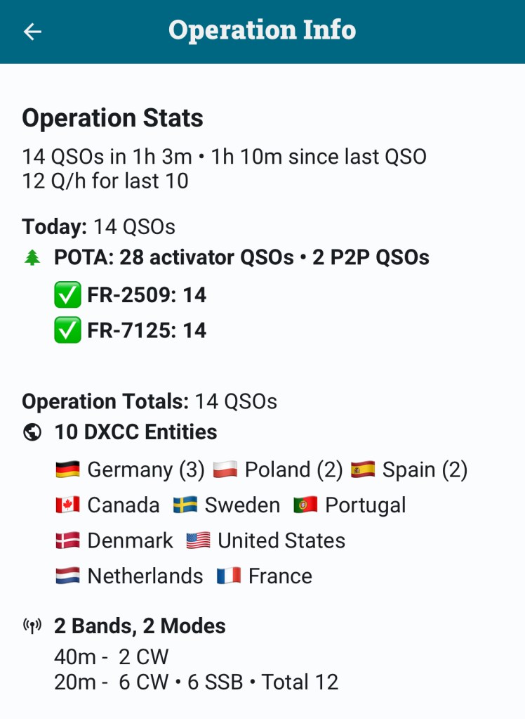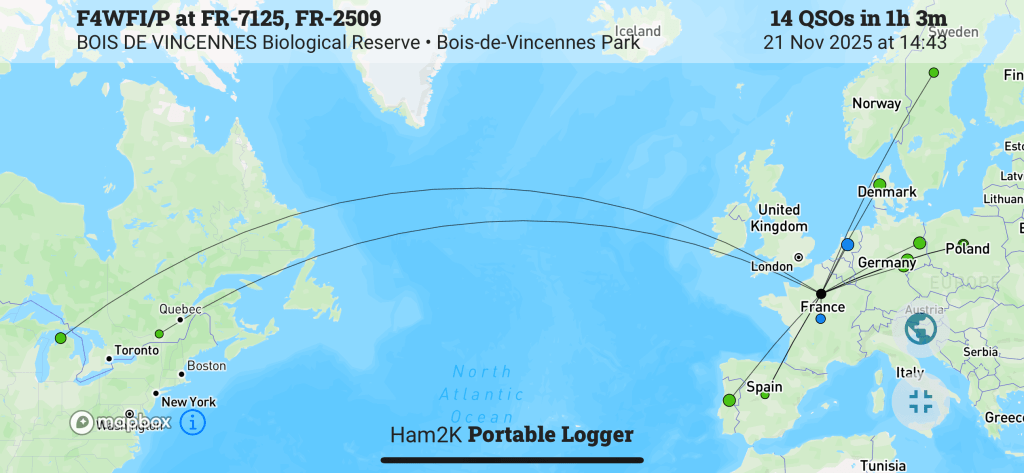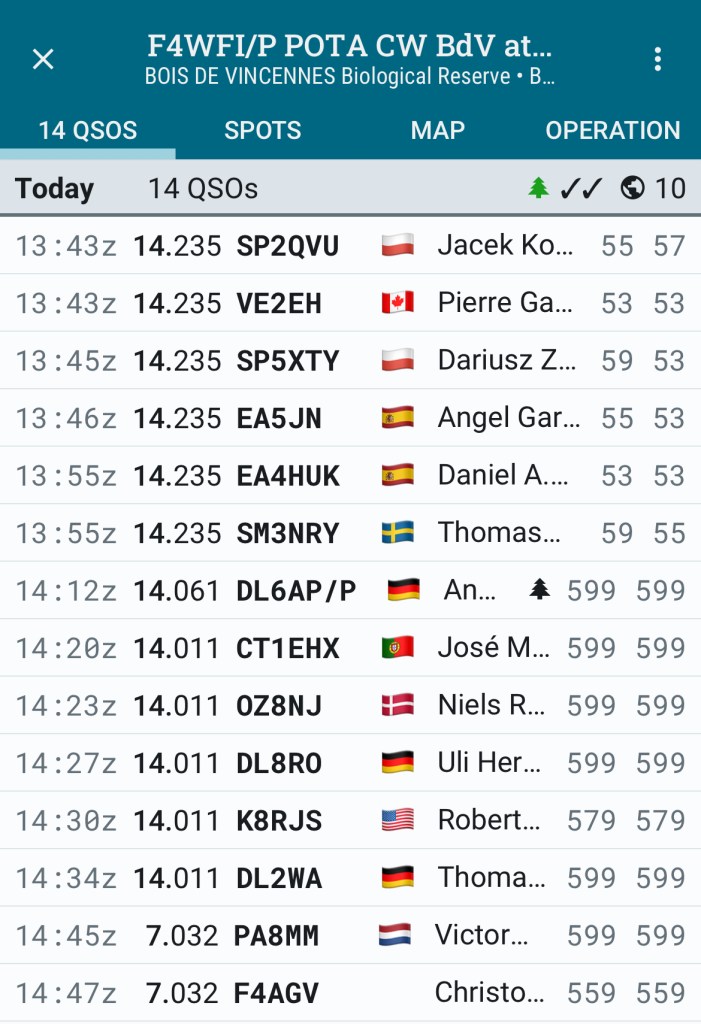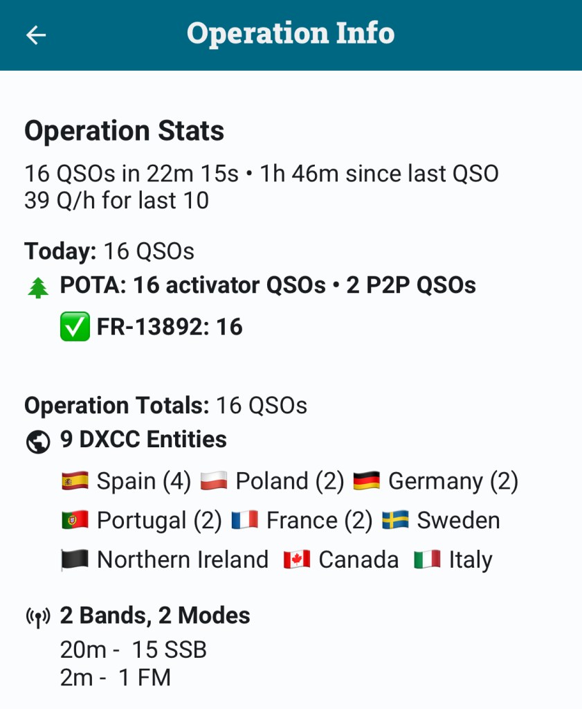 16 QSO en un peu plus d’une heure, je n’en attendais pas tant ! J’étais même très surpris de pouvoir largement dépasser le seuil de 10 QSO pour valider l’activation.