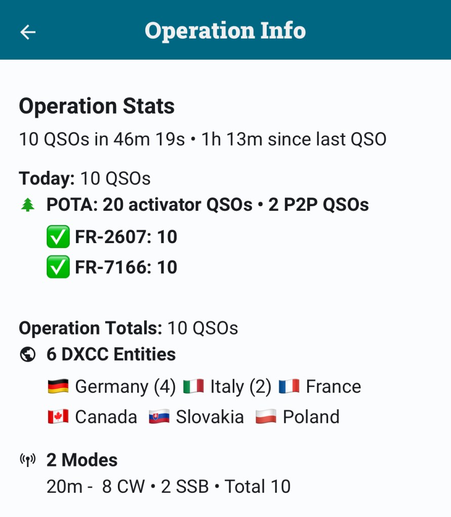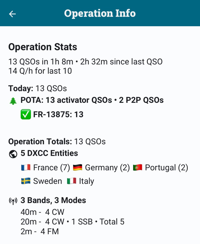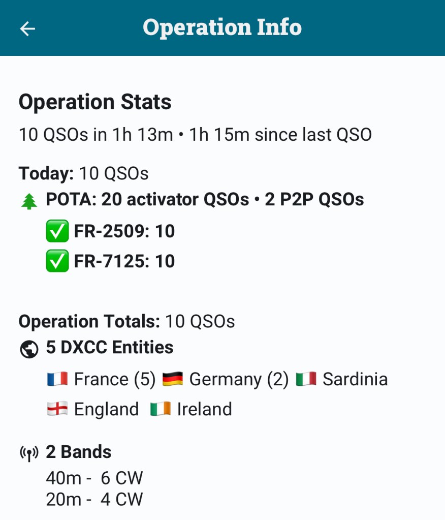 Comme l’autorise le règlement POTA, je doublais quand c’était possible les QSO en VHF et en UHF. Ca marchait en général moins bien en UHF, ce qui est naturel.