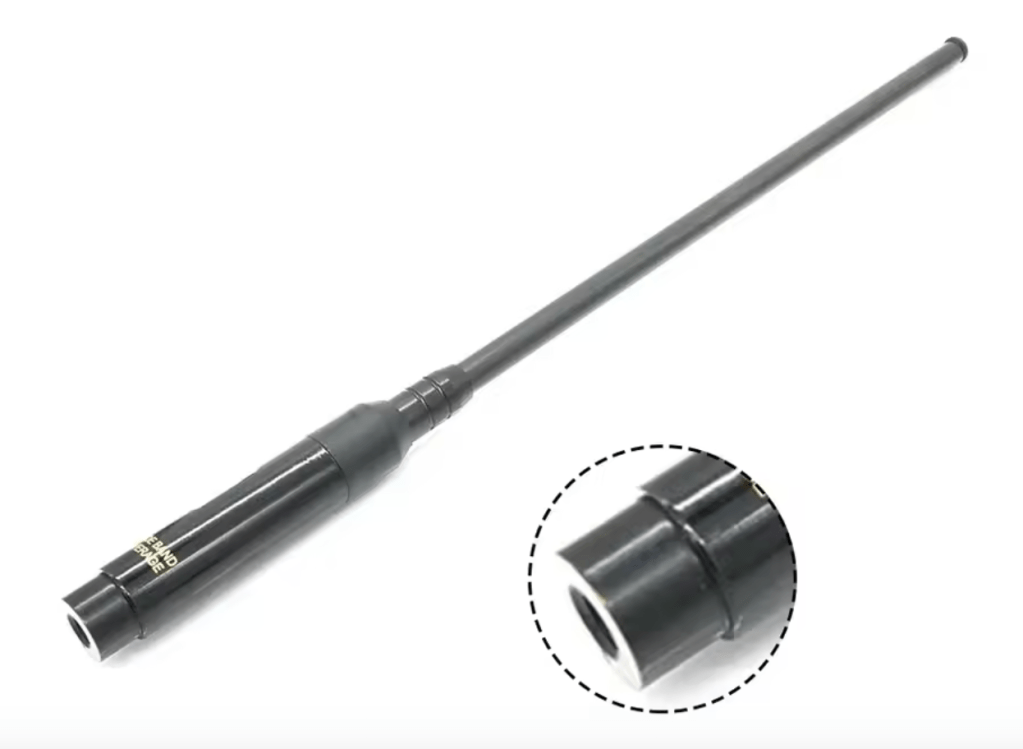 Côté antenne, j’ai démarré avec l’antenne boudin Yaesu d’origine et puis ensuite j’ai monté la RH660s récemment achetée en ligne. C’est une antenne télescopique métallique de 1,08m qui a bien amélioré l’activité radio.