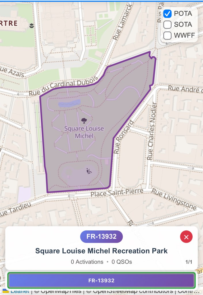 Je suis ainsi arrivé au pied de la basilique du Sacré Coeur dans le Square Louise Michel POTA FR-13932 sur le coup de 20:00. A noter que ce parc est partiellement ouvert à cette heure là.