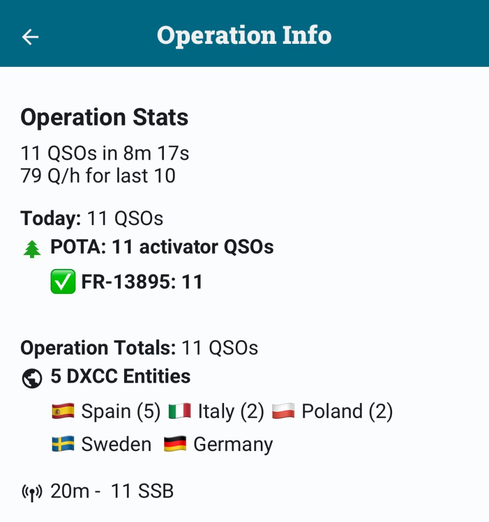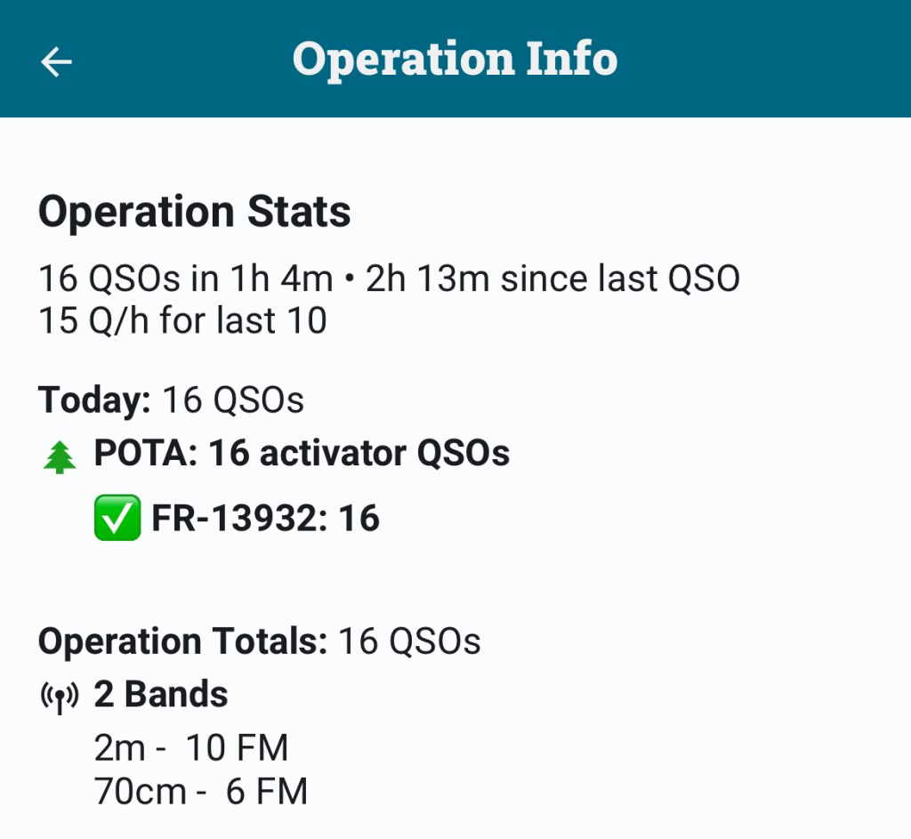 Très heureux de réussir cette activation à 100% sur 2m et 70cm, c’est assez kiffant de n’utiliser qu’un pocket pour faire du POTA. C’était aussi la première fois que cette référence était activée.