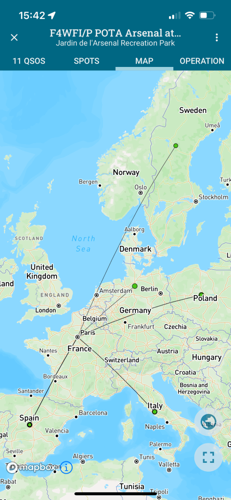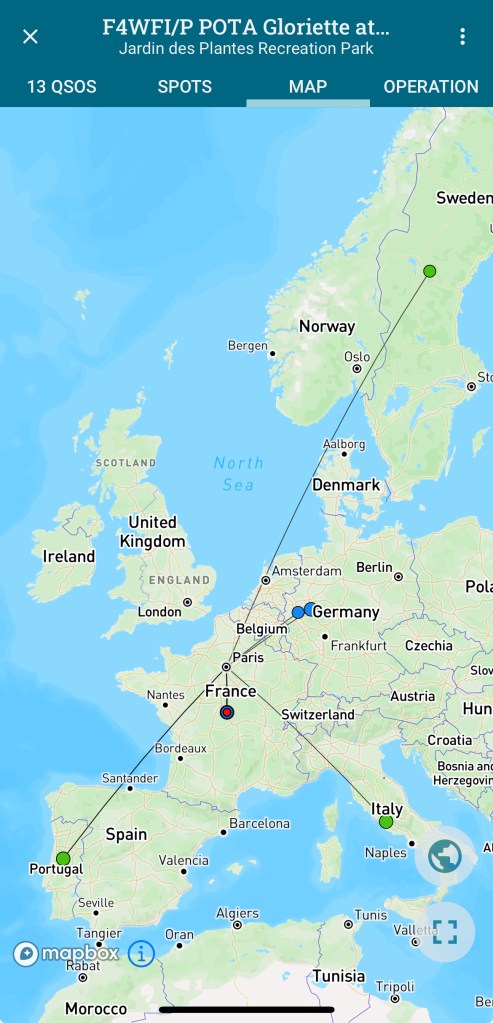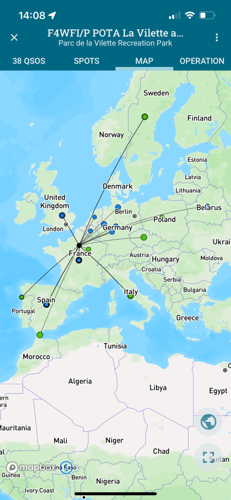 Au final, en terme de distance, cela a du faire environ 20 à 30km au maximum pour les QSO les plus lointains et quelques km pour les plus proches. Bien sûr les 120m d’altitude de Montmartre donne un bon coup de main.
