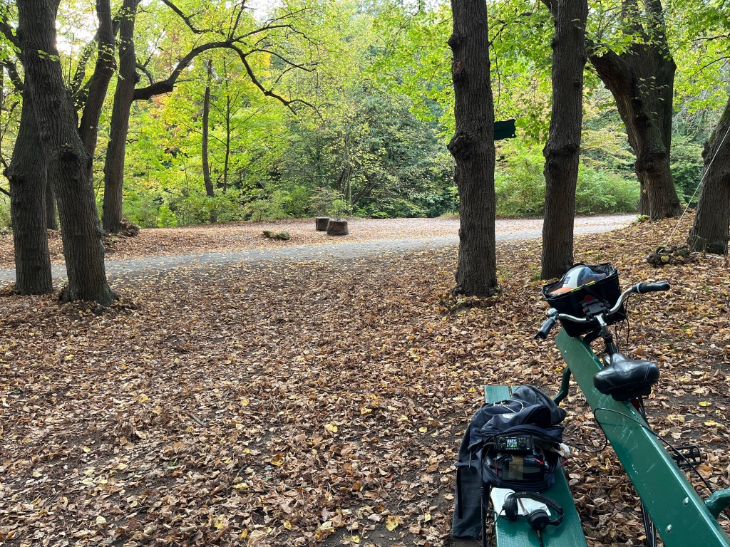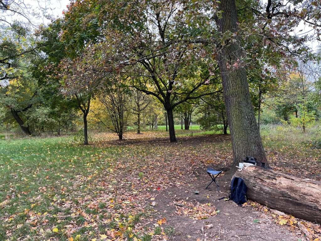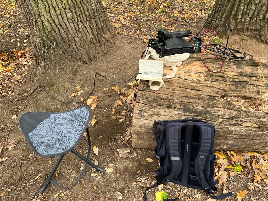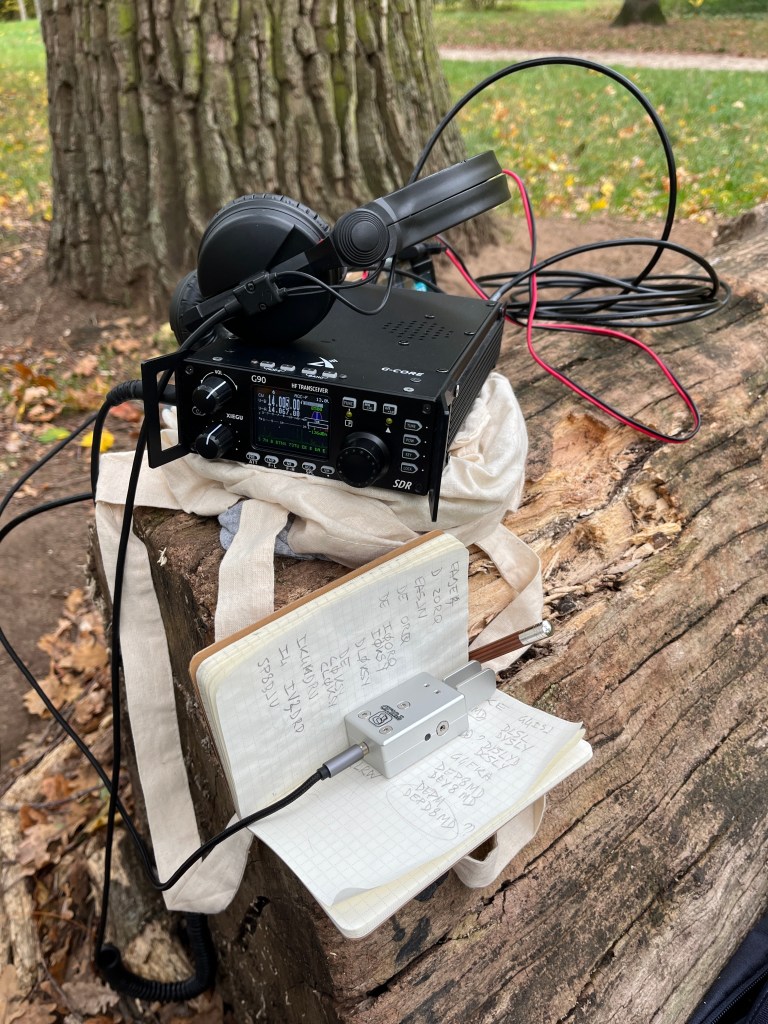 Voilà l’antenne montée en sloper (c’est à dire en pente) dans le bois de Vincennes, on voit bien le boitier avec le unun 49:1 et le câble coaxial qui va vers le Xiegu G90 :